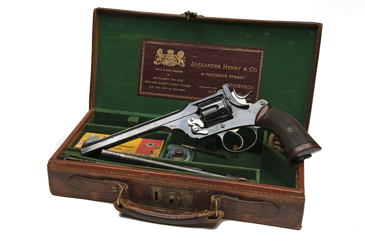 circa 1905, with blued 7 1/2in. barrel, break-open frame with auto-ejecting quick release fluted cylinder, double action mechanism and chequered rosewood square-based grips, the whole retaining much original factory finish, 14 1/4in. overall, in a leather covered storage case with retailer's label for Alexander Henry, compartmented and lined in green baize and including an obsolete calibre .297/230 sub-calibre adaptor (serial no. 221), a Kynoch bullet carton, cleaning rods and a lanyard, together with a 7 1/2in. full flap leather holster, possibly from another