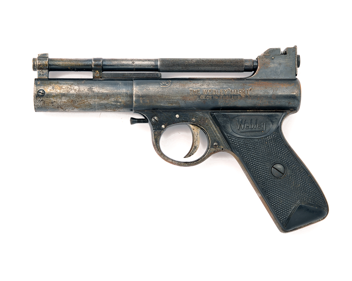 A .22 BARREL-COCKING AIR-PISTOL SIGNED WEBLEY & SCOTT, MODEL 'POST WAR MKI', batch no. 678, with 6 5/8in. barrel, stepped receiver and chequered hard rubber grips, finish badly worn