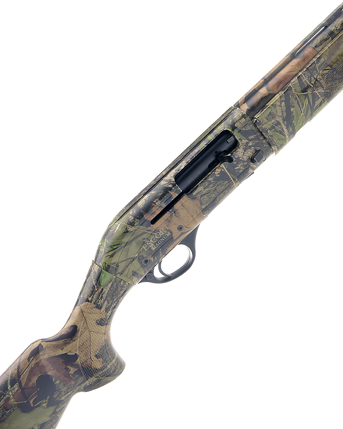 HATSAN 12-BORE (3IN.) 'ESCORT MAGNUM' SEMI-AUTO SHOTGUN, serial no. 324735, restricted magazine, 28in. nitro barrel with 6mm ventilated matt rib, 3in. chamber, multichoke (no spares), manual push-button safety, magazine cut-off switch, 14 1/2in. synthetic pistolgrip stock including ventilated rubber recoil pad, the whole wrapped in camouflage effect finish