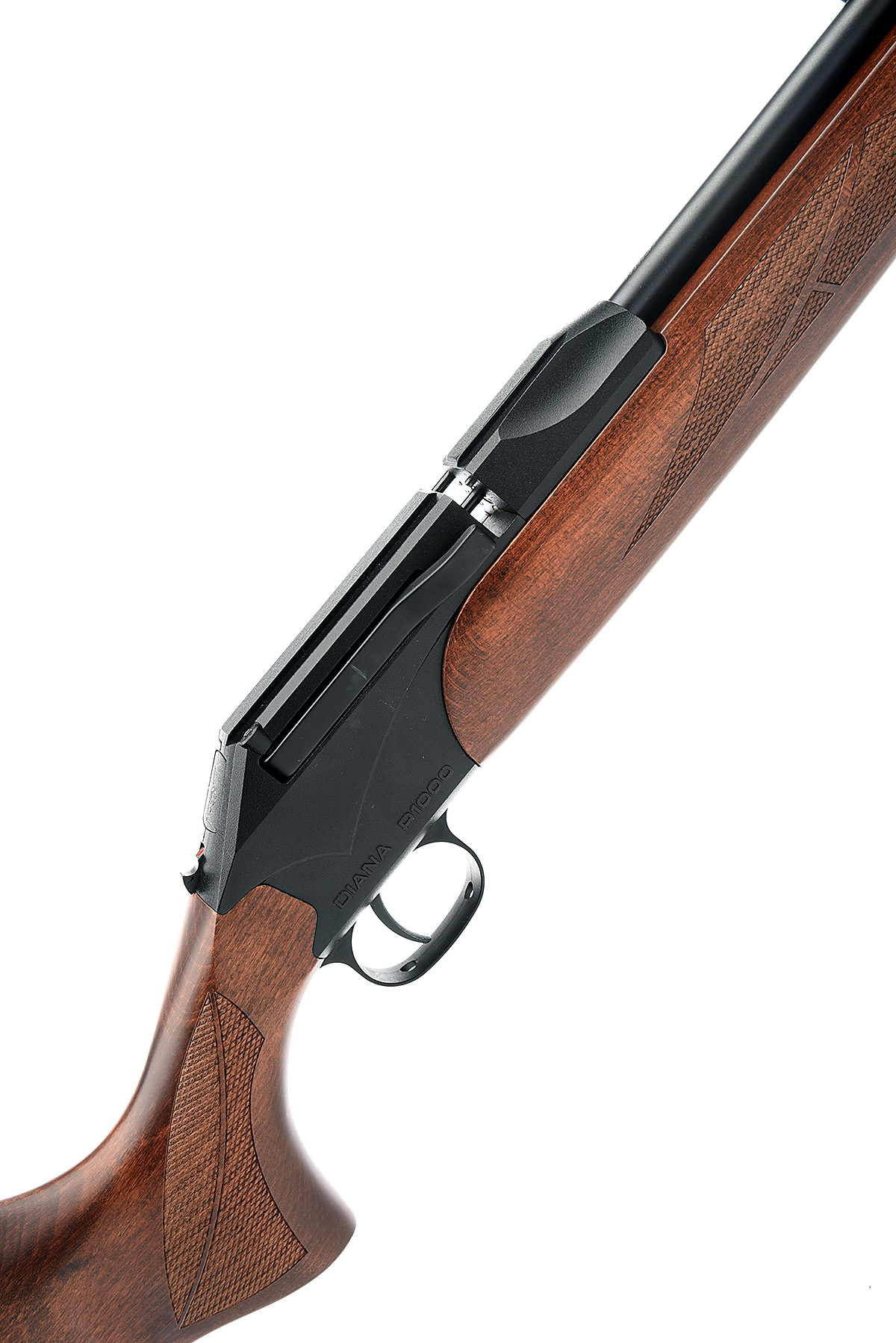A .177 PRE-CHARGED PNEUMATIC AIR-RIFLE SIGNED DIANA, MODEL 'P1000', serial no. 01560891, recent, with 18in. barrel threaded for a sound moderator, alloy side-lever operated receiver (missing magazine), chequered beech butt-stock and fore-end, under-barrel air reservoir with gauge, untested but appearing little used, 38in. overall