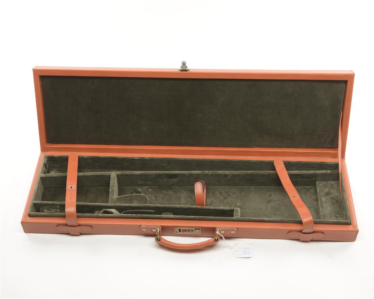 A LEATHER SINGLE GUNCASE, fitted for 30in. barrels, the interior lined with green baize, single brass combination lock