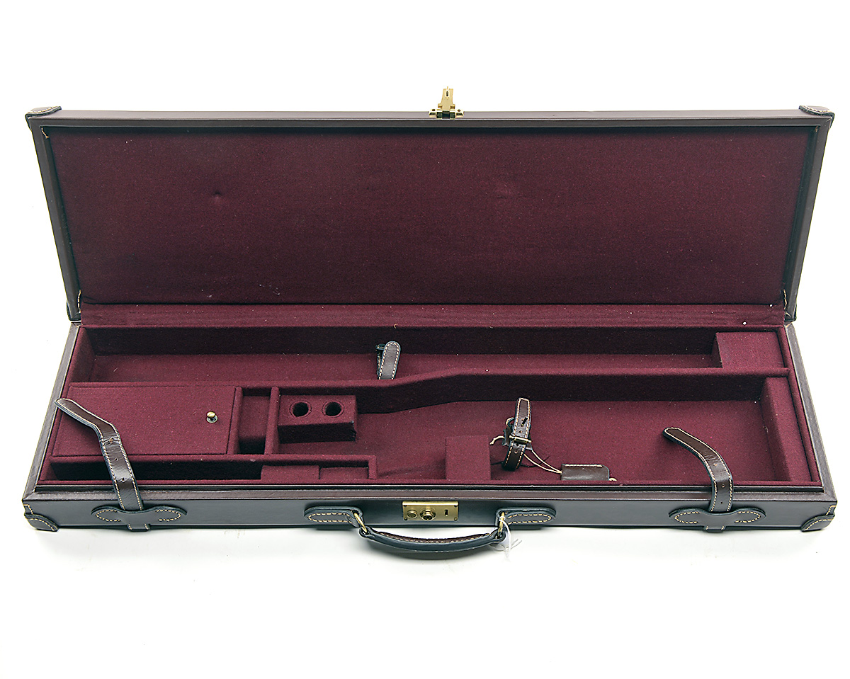 A GUARDIAN LEATHER SINGLE UNIVERSAL GUNCASE, fitted for 34in. barrels, the interior lined with maroon baize, brass lock (including key)