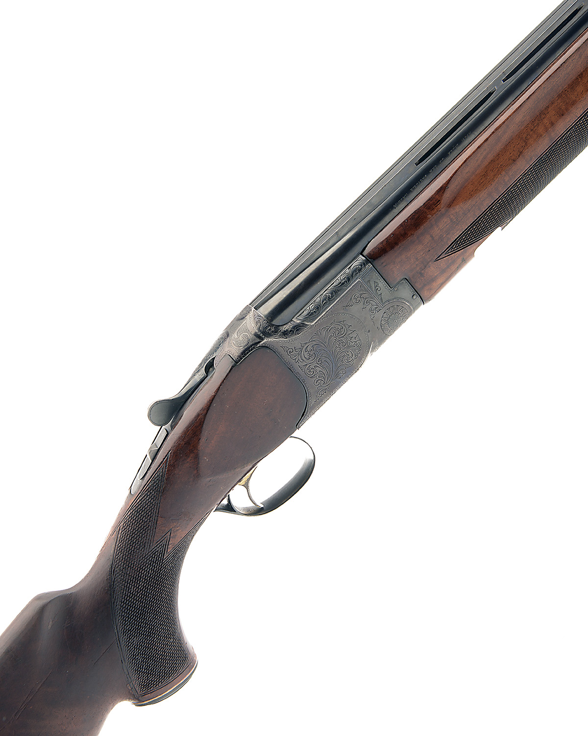 MIROKU 12-BORE SINGLE-TRIGGER OVER AND UNDER EJECTOR, serial no. 575784, 26in. nitro barrels with 15mm ventilated matt top-rib, 2 3/4in. chambers, bored approx. true cyl. and 1/4 choke, hold-open toplever, manual safety with integral barrel-selector switch, gold-washed single trigger, border and scroll engraving, blued finish, 13 3/4in. pistolgrip stock (cracked through and glued at hand), including buttplate