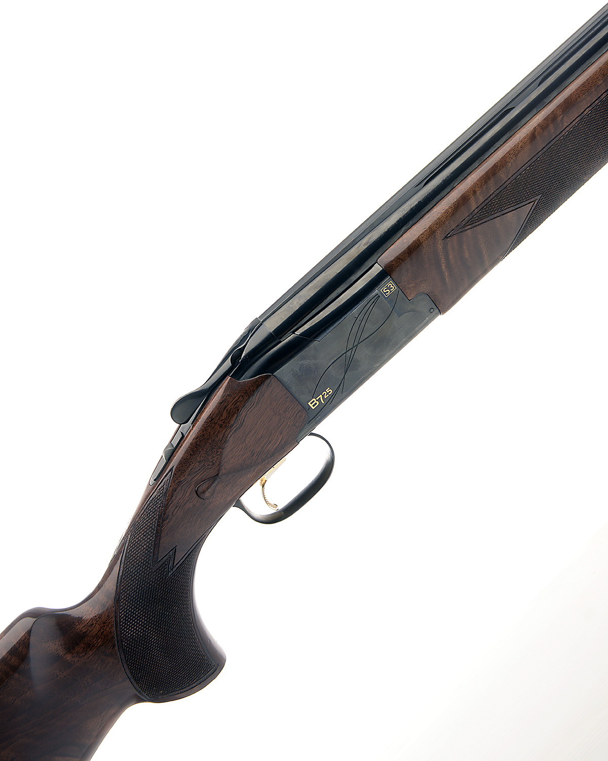 THE STOCK, ACTION AND FOR-END ONLY OF A BROWNING S.A. A 12-BORE (3IN.) 'B725 SPORTER S3' SINGLE-TRIGGER OVER AND UNDER EJECTOR, serial no. 59123ZX, extended Invector DS multichokes (with spares), hold-open toplever, automatic safety with integral barrel-selector switch, adjustable gold-washed trigger (with two spares), blacked action with geometric designs and gold-inlaid with the model designation, 15 1/4in. figured pistolgrip stock with palm swell and including 7/8in. rubber recoil pad, weight 8lb. 1oz (including barrels), in its universal case with paperwork
