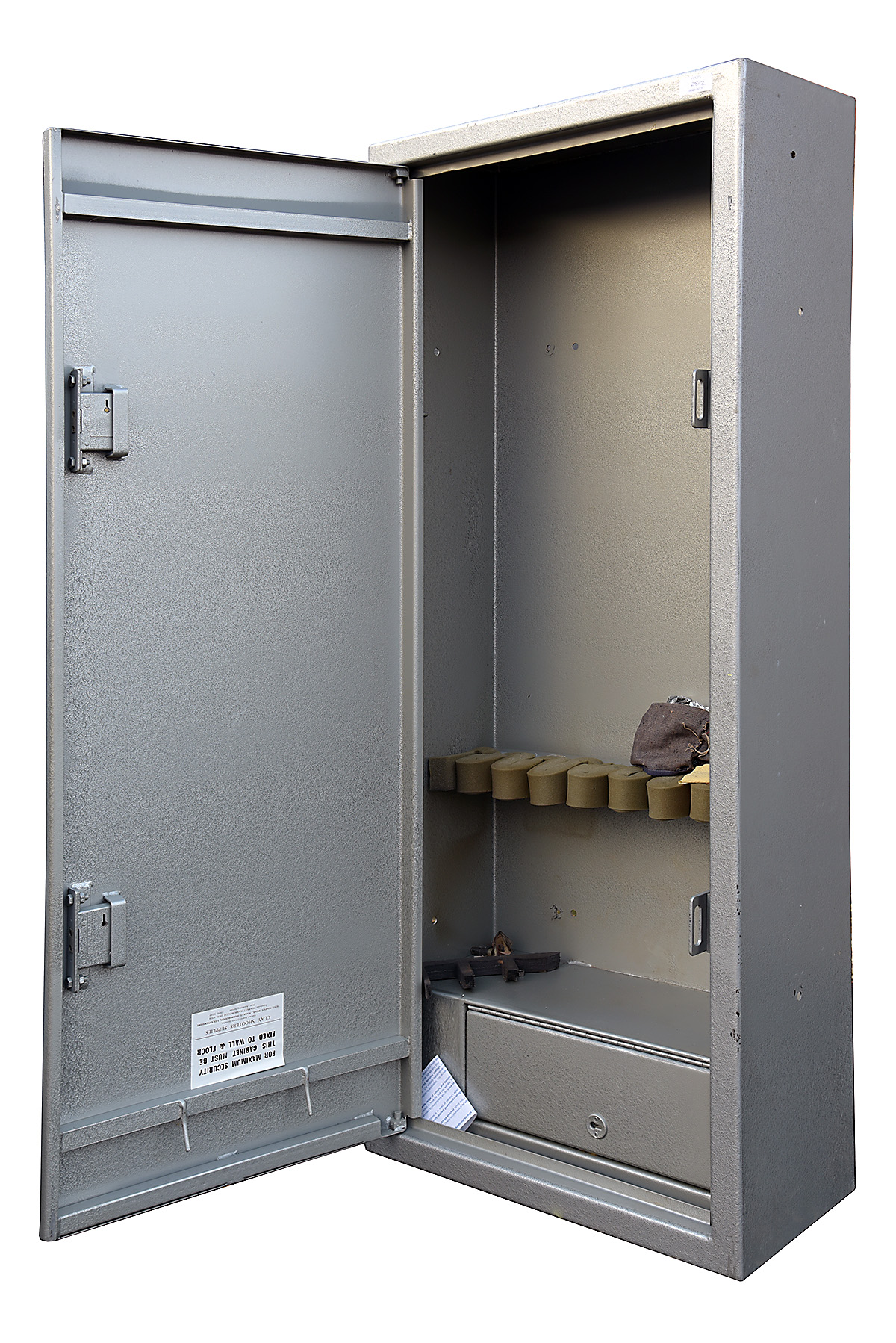 A CLAY SHOOTER SUPPLIES STEEL GUN CABINET, suitable for 8 guns, two security locks with internal ammunition / accessory safe (including all keys), measuring approx. 60in. x 24in. x 12in.
