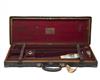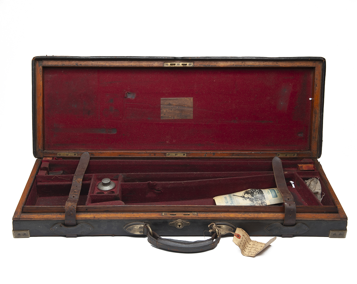 fitted for 28in. barrels, the interior lined with red baize, a Ogden Smiths & Hussey trade label, Hussey oil bottle, central brass push-button lock (key missing),