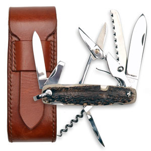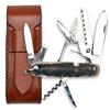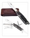 a hand-made nine piece tool with large and small blades, saw, scissors, bottle opener screw driver file, hole puncher, with fitted stitched leather sheath
