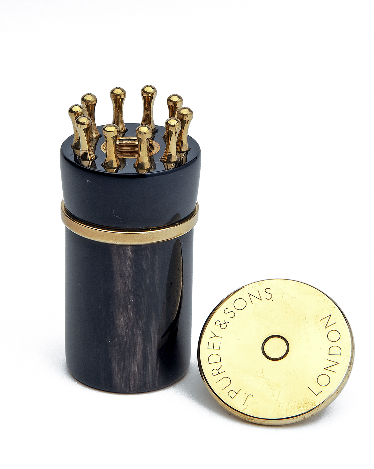 brass top engraved 'J. PURDEY & SONS LONDON', unscrewing to reveal ten numbered brass pegs