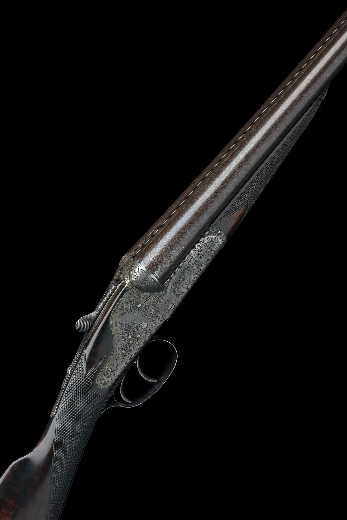 circa 1903, 30in. nitro damascus barrels, the tubes engraved 'CHARLES LANCASTER. 7. BURY STREET. ST. JAMES'S. LONDON.' and the rib inlaid '1', 2 1/2in. chambers, bored approx. imp. cyl. and 1/2 choke, Lancaster patent assisted-opening action, carved fences, striker discs, slim toplever gold-inlaid '1', automatic safety with blue enamelled 'SAFE' detail, dipped-edge lockplates, mainspring cramp adjuster screws, fine border and acanthus scroll engraving, 14 1/4in. figured stock including buttplate, weight 6lb. 12oz.