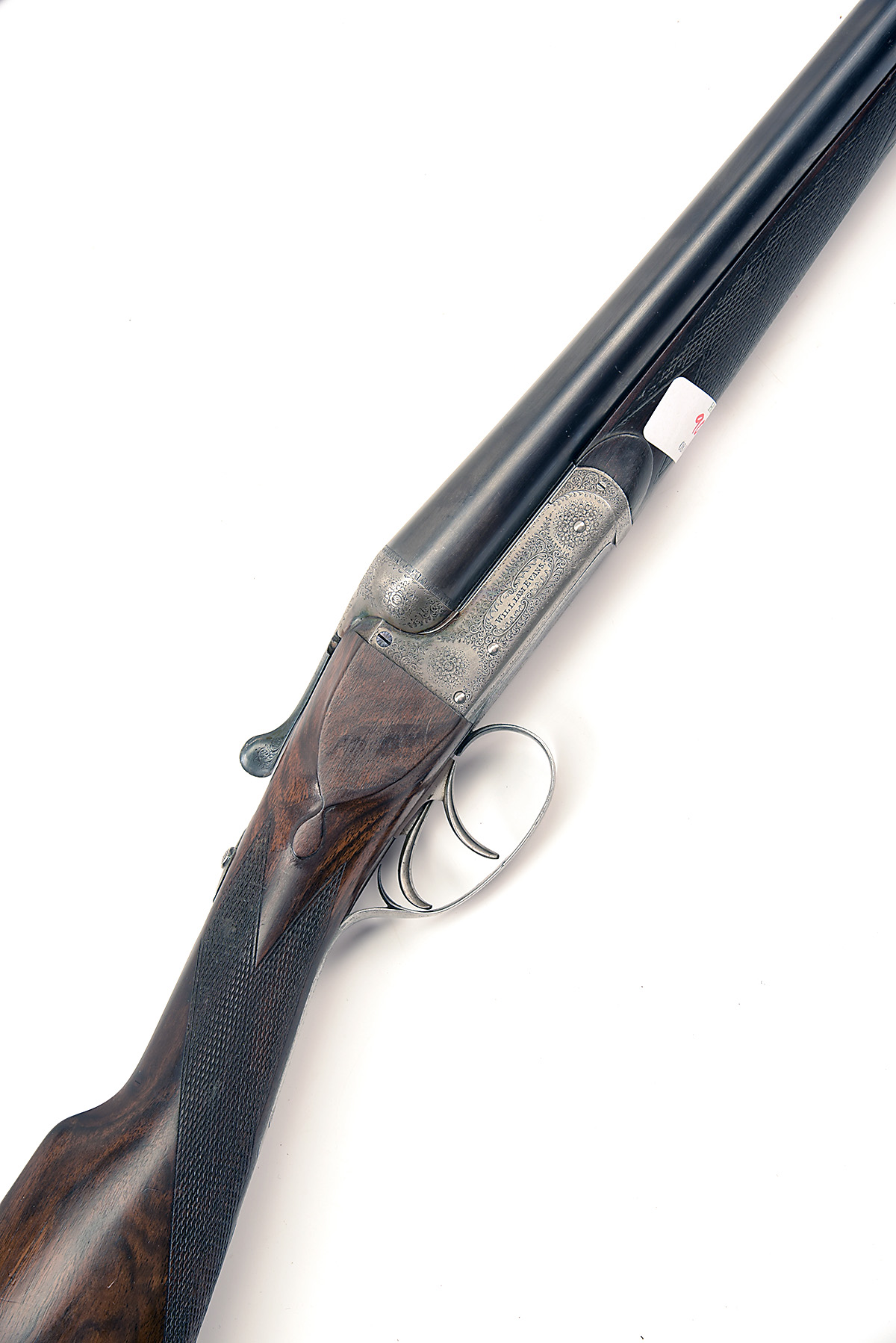 WILLIAM EVANS 12-BORE (CROSSOVER) BOXLOCK EJECTOR, serial no. 11167, 30in. nitro barrels, rib engraved 'WILLIAM EVANS. 63. PALL MALL. ST. JAMES'S. LONDON. S.W.', 2 1/2in. chambers, bored approx. 1/2 and 3/4 choke, treble-grip action, removable striker discs, intercepting sears, automatic safety with gold-inlaid 'SAFE' detail, bouquet and scroll engraving, retaining some original colour-hardening and finish, 16 1/4in. figured crossover stock (right shoulder left eye) including 1in. ebonite extension, bolstered fore-end wood, weight 7lb. 2oz. in its makers brass-cornered leather case