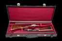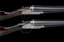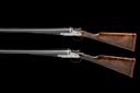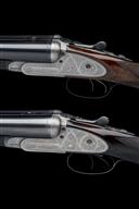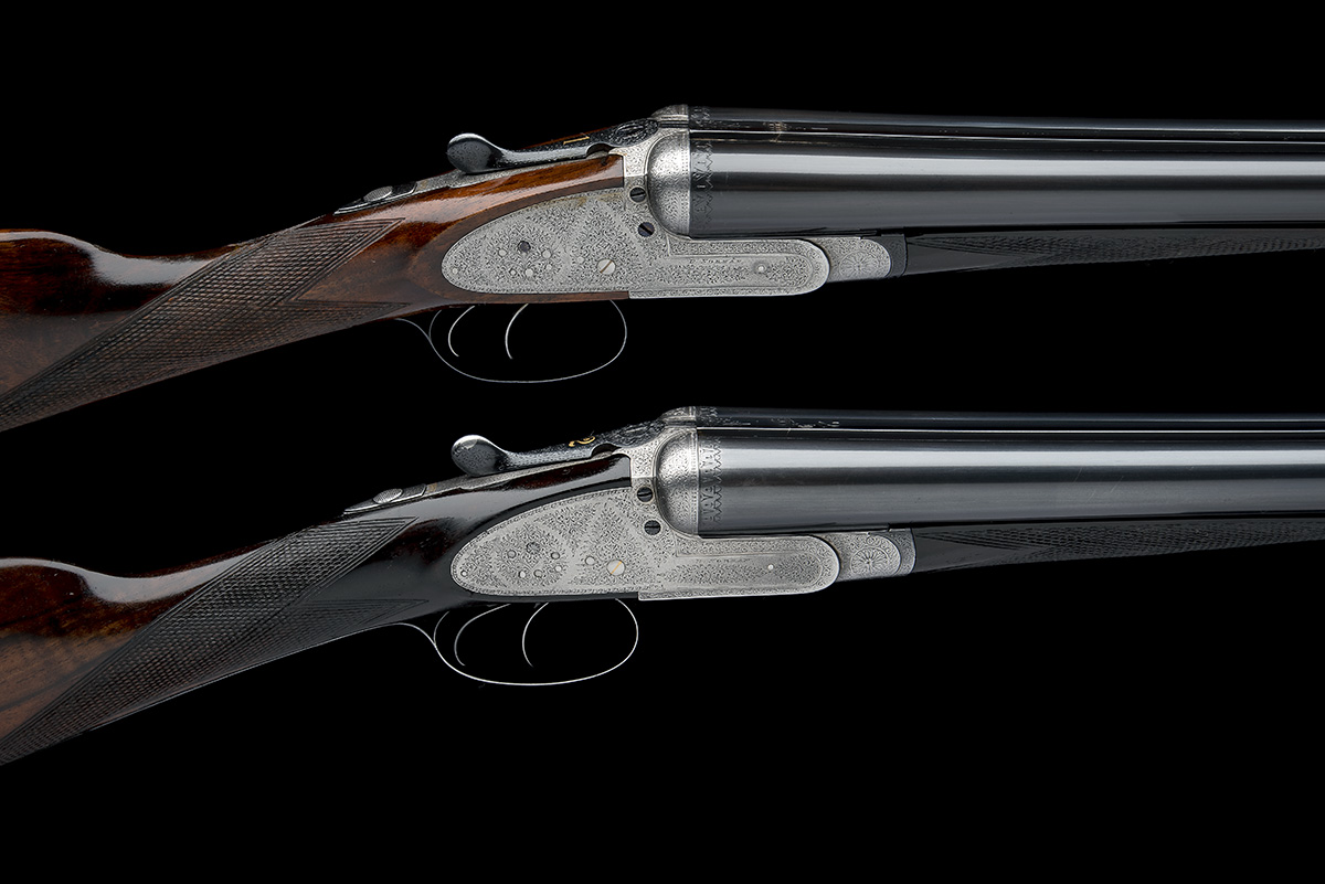 first quarter of the 20th century, 26in. nitro reproved barrels (in 1960 and 1967), the ribs engraved '1' and '2' at the breech-ends, 2 1/2in. chambers, bored approx. 1/2 and full (No.1) 1/4 and full (No.2), treble-grip actions, toplevers gold-inlaid '1' and '2', automatic safeties with gold-inlaid 'SAFE' details, gold-inlaid cocking indicators, border and acanthus scroll engraving, brushed bright and blued finish overall, 14 1/4in. figured stocks including 7/8in. rubber recoil pads, (No.1 a replacement, No.2 cracked at hand), weight 6lb. 9oz. (No.1) and 6lb. 12oz. (No.2), in a double guncase
