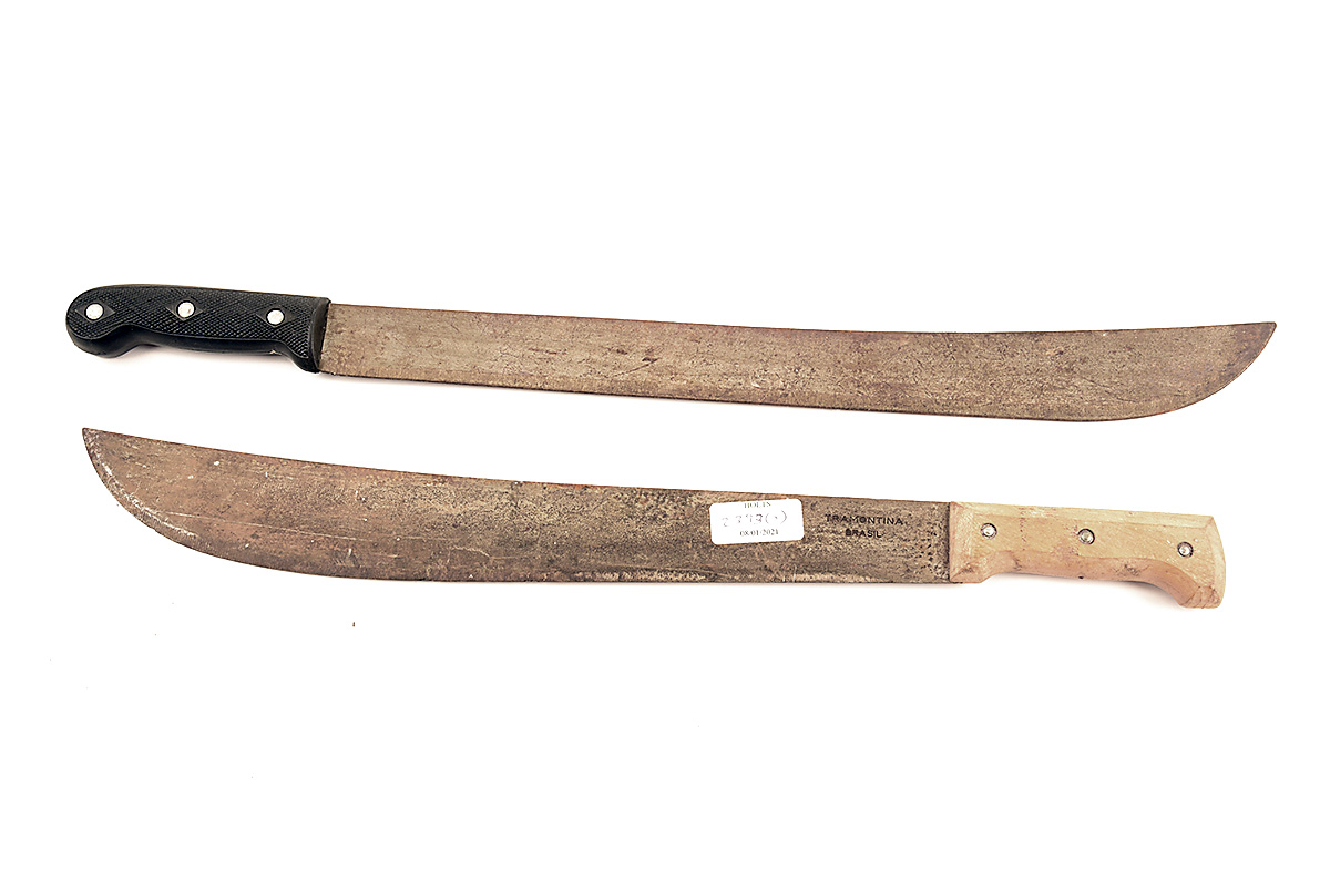 A PAIR OF MILITARY-STYLE MACHETES one with 18in. blade and 5in wooden handle, with blade marked 'TRAMONTINA / BRAZIL', the other with 19 1/2in. blade and 5in. plastic handle, unmarked, both blades with surface rust