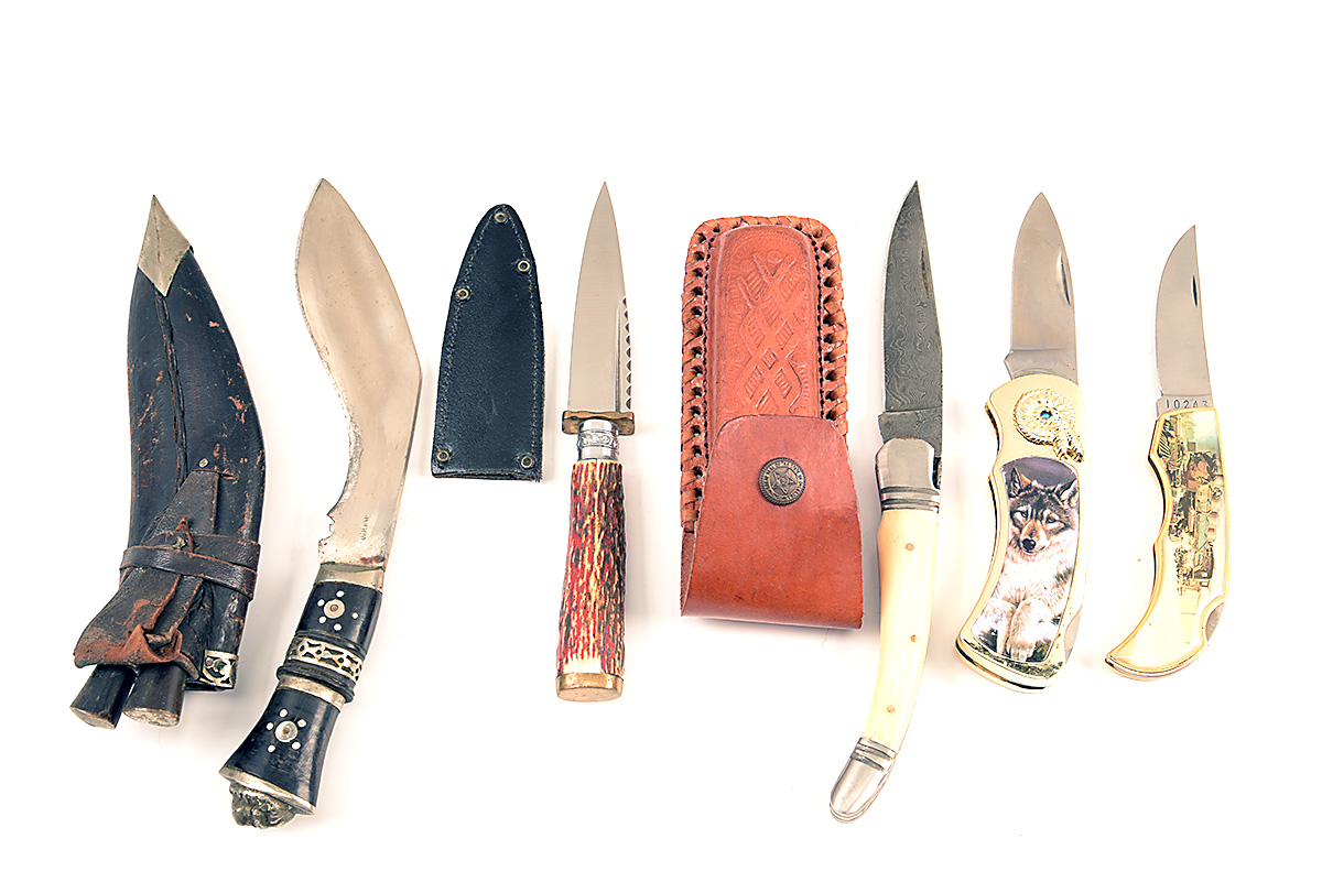 A COLLECTION OF FIVE KNIVES FOR THE TOURIST MARKET one lock-knife with 4 1/2in. blade, overall 5in. when closed, with ivorine handle and leather case, one sheath-knife with 3 1/2in blade, 7 1/2 in. overall with imitation antler handle and black leather scabbard, one lock-knife with 3in. blade, 4in. when closed, plastic casing with wolf picture inset, one lock-knife with 2 1/2in. blade, 3 1/2in when closed, plastic casing with transfer-printed American locomotive, and an Indian kukri with 6in. blade and 3in handle with lion-head pommel and white metal inlays contained in a black leather scabbard with white metal mounts also containing two small fruit-knives, all without marke-marks and all used with wear