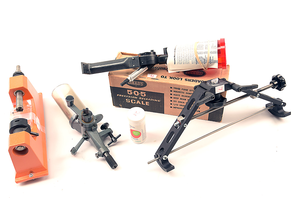 A COLLECTION OF CARTRIDGE RELOADING EQUIPMENT, comprising of a dolphin tracher rest, lyman adjustable powder thrower, ely-kynoch marshall power start cartridge, ohaus s.o.s precision scales, lyman case length trimmer & 9 pilots, lyman adjustable powder thrower,