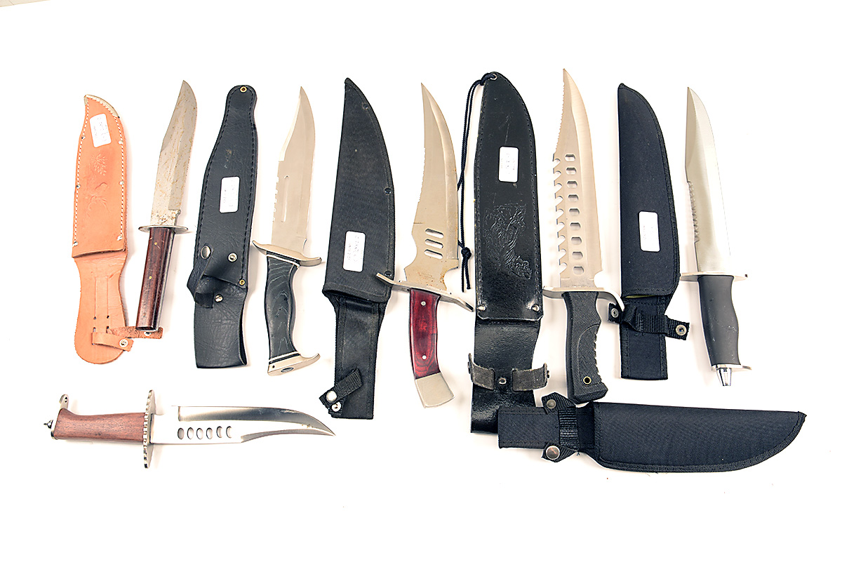 A GROUP OF SIX LARGE BOWIE-TYPE KNIVES one 12in. with serrated back edged blade and rubber grip 17in overall in embossed black leather scabbard, one 8in. blade with wooden grip, 13in. overall in embossed brown leather scabbard, one 9in blade, angled cross-guard, 14 1/2in. overall in black leather scabbard, one with 10in. serrated back edged blade with rubber grip, 13in overall in black canvas scabbard, one 8in. blade with wooden grip, 12in overall in black canvas scabbard, one 11in. serrated back edged blade with angled cross-guard and wooden grip, 14in. overall in black canvas scabbard. all appearing new and unused