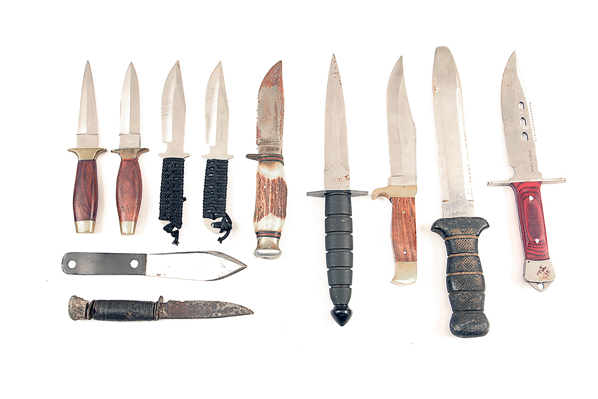 A GROUP OF 11 MIXED KNIVES includes bowie style, double-edged fighting knives and a diver's knife, all used in very mixed condition