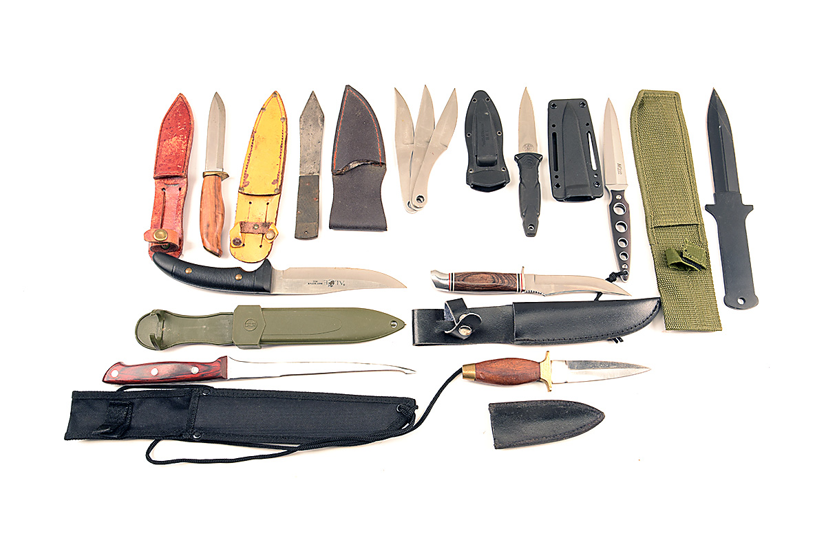 A GROUP OF 12 MIXED KNIVES includes a double-edged Smith & Wesson, a scabbard containing three identical single-edged knives, an M-tech double-edged knife and some tourist pieces, all with their scabbards, mixed condition, some apparently unused