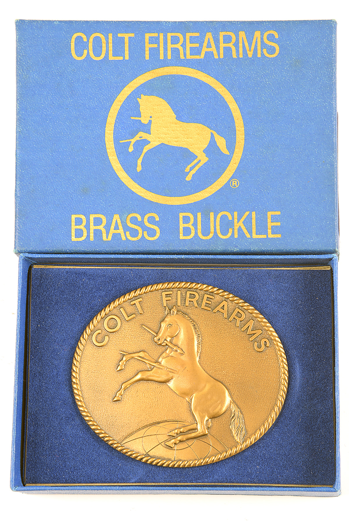 AN UNUSED COLT FIREARMS RAMPANT PONY BRASS BELT BUCKLE, the back marked 'BEWARE OF COUNTERFEITS & PATENT INFRINGEMENTS' Samual Colt's signature, and 'ITEM OF ORIGINAL MANUFACTURE BY COLT FIREARMS. COLT INDUSTRIES OPERATING CORP.', in its makers carton