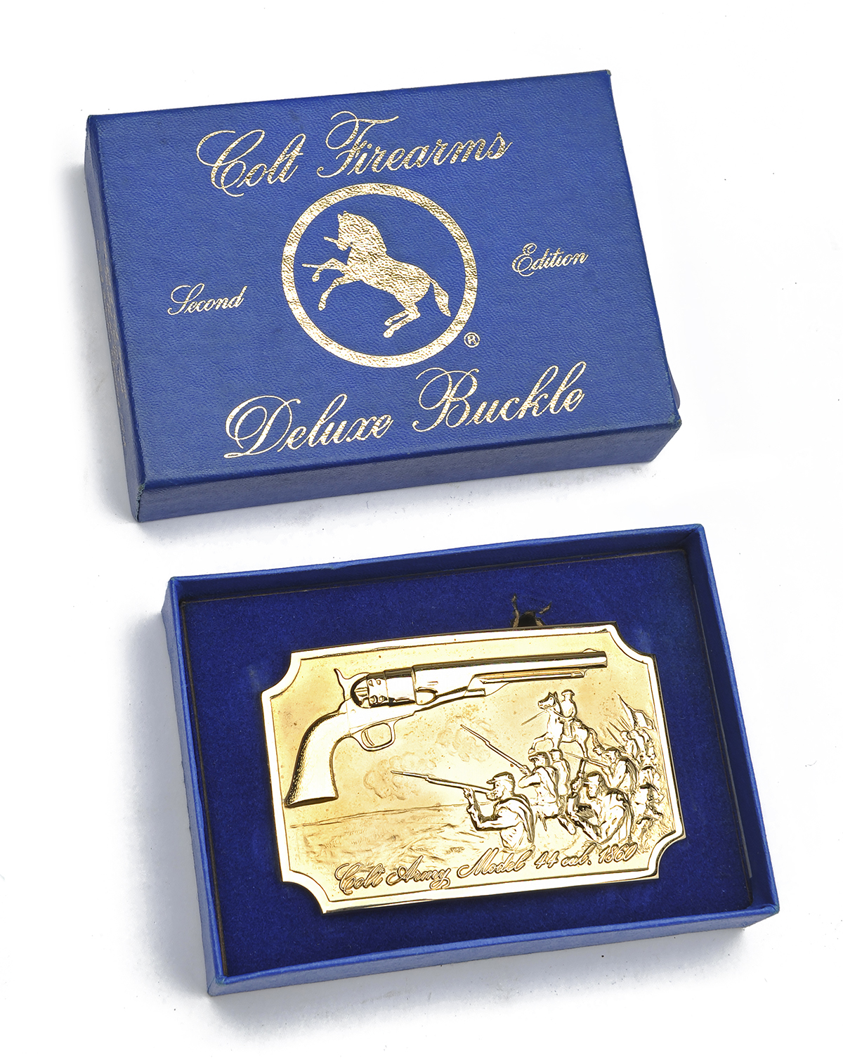 AN UNUSED GOLD-PLATED COLT FIREARMS SECOND EDITION 'MODEL 1860 ARMY REVOLVER' BRASS BELT BUCKLE, the back marked 'MODEL 1860 ARMY REVOLVER PATENTED SEPTEMBER 10, 1850. ITEM OF ORIGINAL MANUFACTURE BY COLT FIREARMS. COLT INDUSTRIES OPERATING CORP. SECOND EDITION.', and with Samuel Colt's signature, in its makers carton