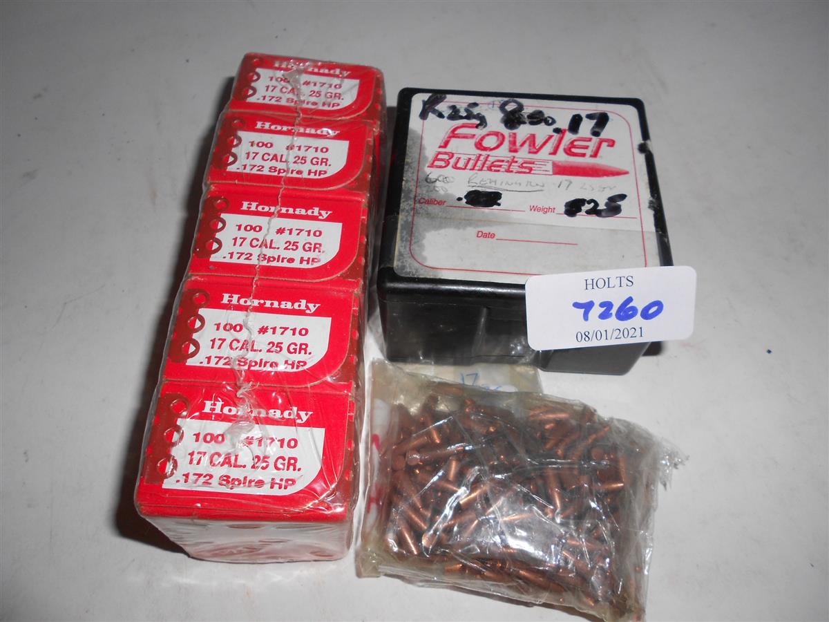 APPROXIMATELY 800 .17 BULLETS, BY HORNADY, FOWLER AND REMINGTON