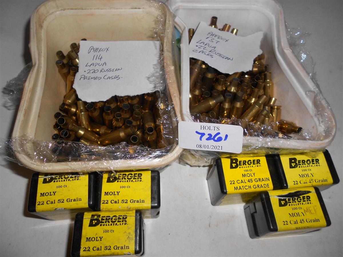 250 .220 RUSSIAN NEW PRIMED AND FIRED CASES WITH 400 .22 cal BERGER MOLY COATED BULLETS, 200 52grn, 200 45 grn. comprising of the following approximate quantities of: