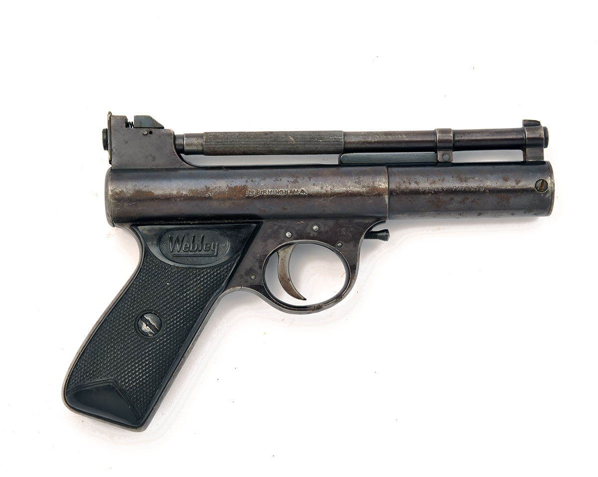 A .22 BARREL-COCKING AIR-PISTOL SIGNED WEBLEY & SCOTT, MODEL 'MKI SLANT-GRIP', batch no. 1739, with 6 5/8in. barrel, stepped air chamber and black hard-rubber grips, fair traces of finish remaining