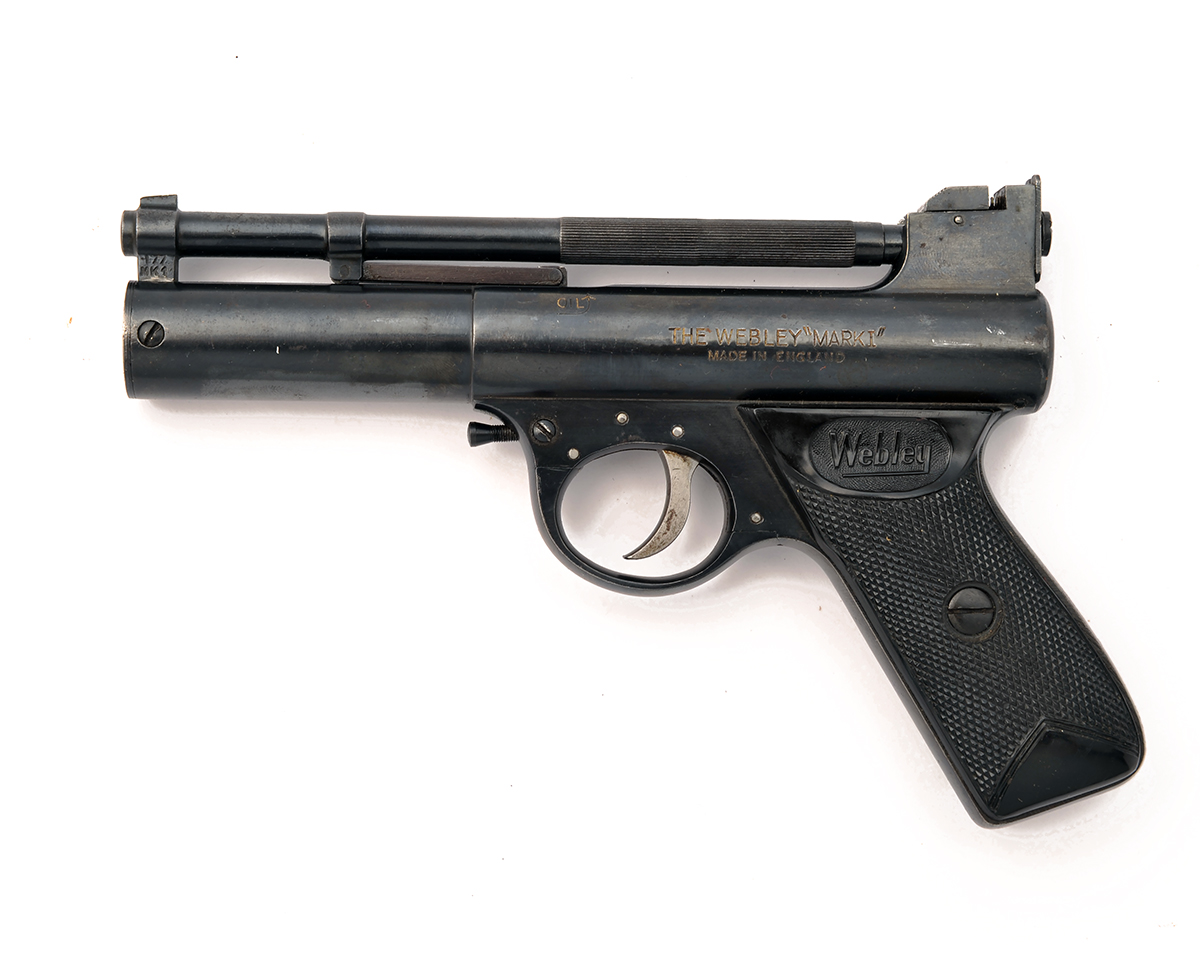 A .177 BARREL-COCKING AIR-PISTOL SIGNED WEBLEY & SCOTT, MODEL 'MKI SLANT-GRIP', batch no. 989, with 6 5/8in. barrel, stepped air-chamber and chequered black hard-rubber grips, strong amount of original blued finish remaining