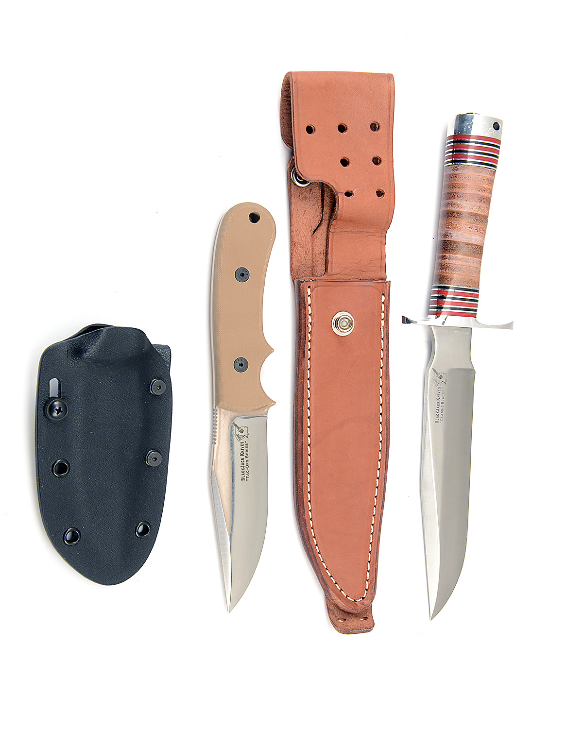 TWO BOXED SHEATH-KNIVES SIGNED BLACK-JACK, the first a 'Model 4' in desert tan finish, complete with its hard abs plastic sheath, the second a Model '1-7' bowie, complete with its leather scabbard, both appearing unused in their makers card cartons