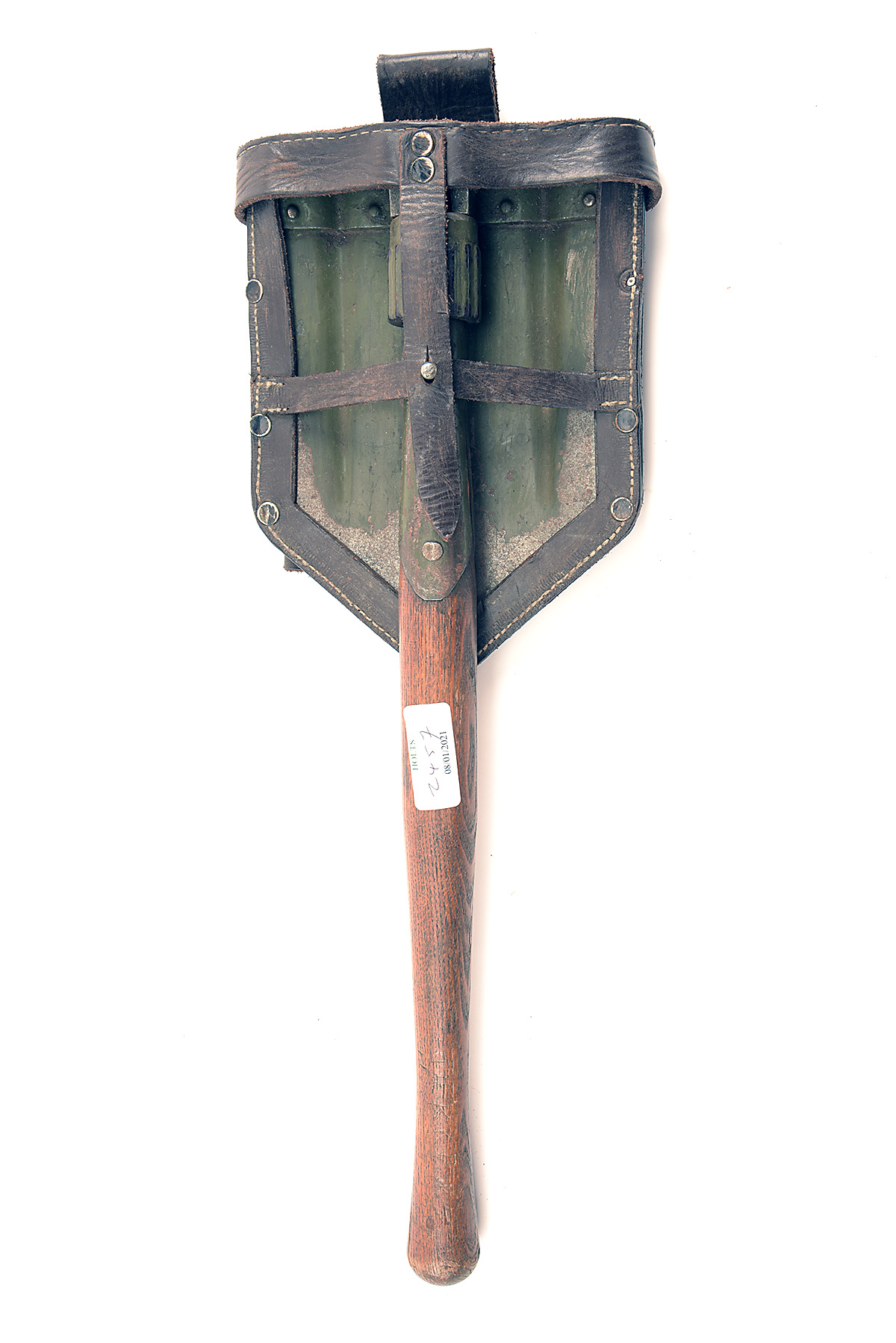 A GERMAN WORLD WAR TWO ENTRENCHING TOOL AND COVER a folding entrenching spade with much original green paint together with its leather cover with manufacturer's stamp and dated 1942