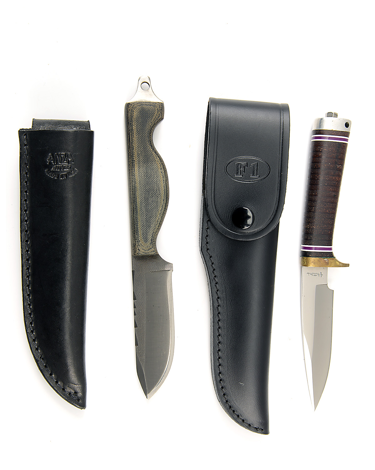 TWO SMALLER SHEATH-KNIVES, the first signed Hattori, with 3 3/4in. blade and leather ring handle, the second signed Anza, with parkerised 3 1/2in. blade and shaped micarta handle, both with black leather scabbards and appearing unused