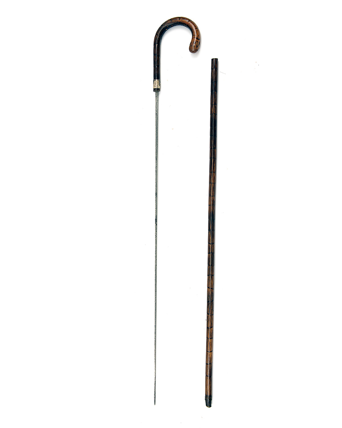 A BAMBOO EFFECT SWORD STICK with white metal collar repair to support blade, 28 1/2in square blade, brass ferrule, worn