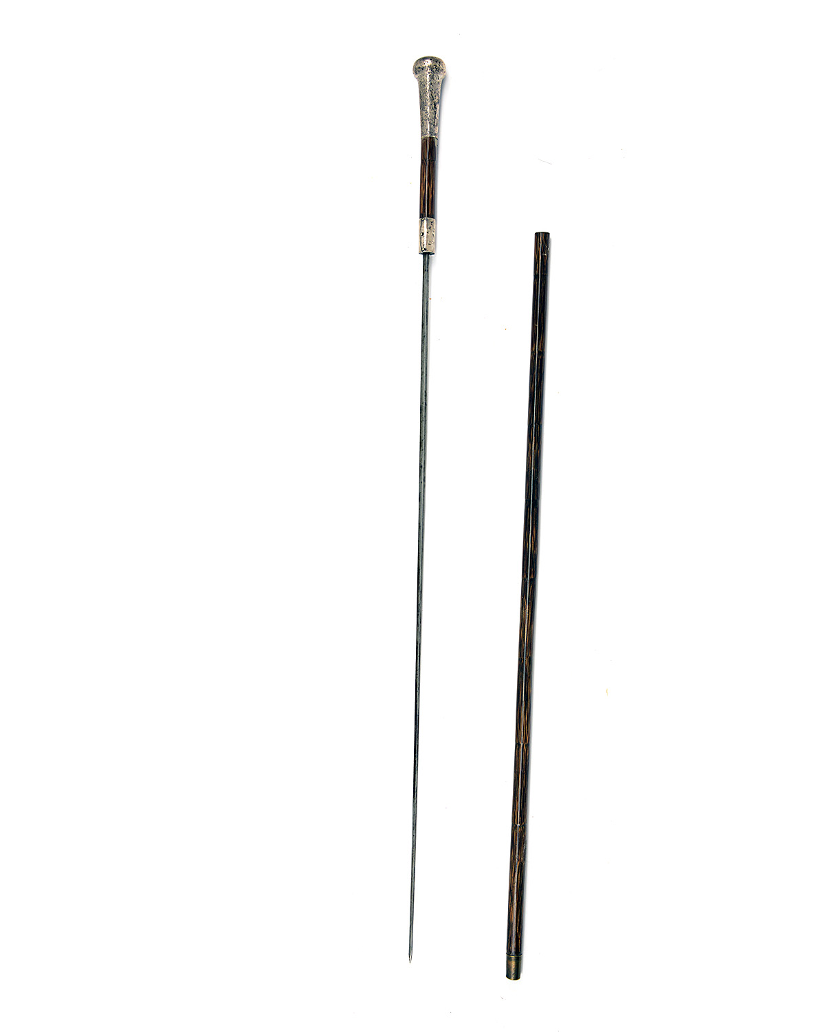 A SILVER MOUNTED BAMBOO EFFECT SWORD STICK circa 1900 with bulbous silver handle (loose, with heavily rubbed marks), silver collar repair, brass ferrule, 26in. square blade, worn