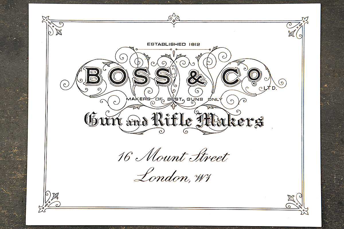 A MODERN BOSS & CO. GUN AND RIFLE MAKERS GUNCASE TRADE LABEL, 16 Mount Street London, W1, measuring approx. 5 1/4in. x 5in.