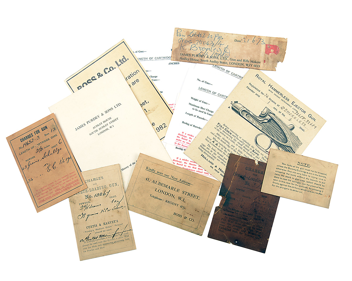 A COLLECTION OF VINTAGE GUNCASE 'NOTES' AND 'CHARGES' LABELS, comprising of a James Purdey & Sons ' A Short History of the Firm' card, a Holland & Holland Royal Hammerless Ejector Gun cartridge charges guncase label, a 'Kindly note our New Address 41, ALBEMARLE STREET LONDON, W.1 telephone REGENT 0711 BOSS & CO.' card, a 3 x vintage guncase 'Charges' cards with serial no.' 13267, 19652-3, unreadable), together with a collection of modern 'LENGTH OF CARTRIDGE' paper labels