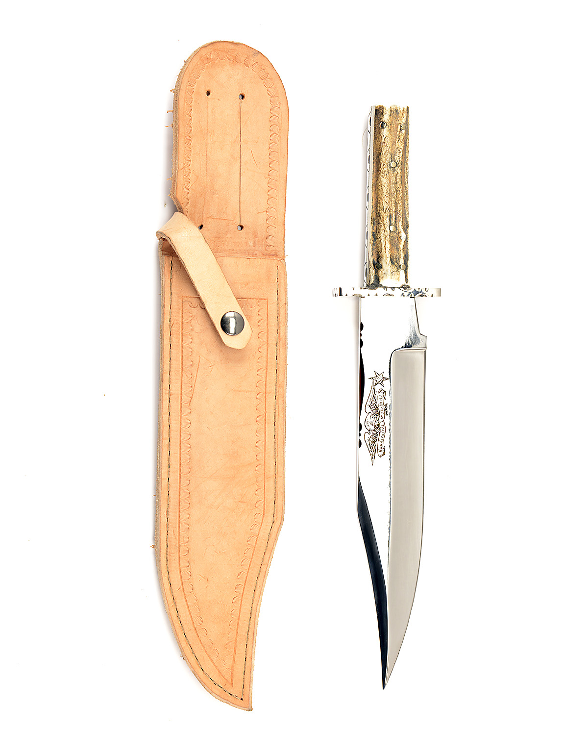 A SHEFFIELD BOWIE-KNIFE, with spearpoint 9in. blade etched 'HANDCRAFTED IN SHEFFIELD' below an eagle device, squared cross-guard with decorated edges, natural staghorn coffin hilt and complete with a leather scabbard, appearing unused