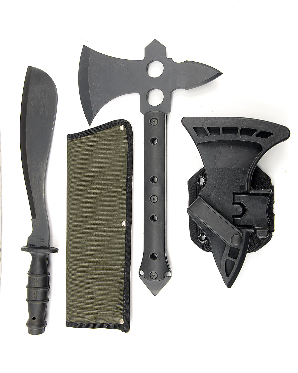A SURVIVAL AXE TOGETHER WITH A BUSH-KNIFE, the first unsigned and finished in black, 15in. overall with bearded head and points to top, pommel and reverse, in its abs plastic belt-holder, the second of klewang form with 11in. blacked blade signed 'NOWILL, SHEFFIELD', ribbed rubber handle and cordura sheath