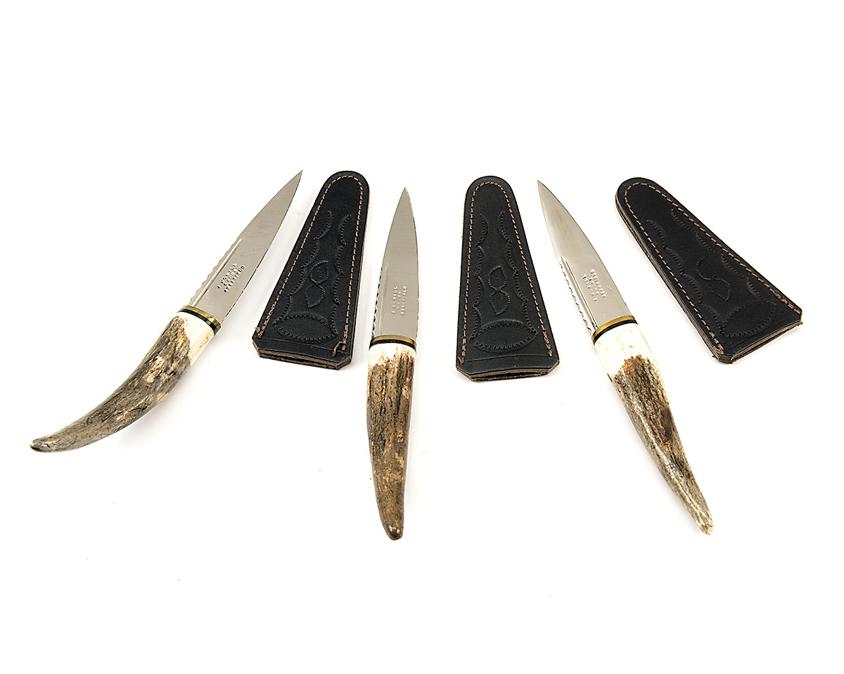 THREE MODERN SKEIN-DUBH SOCK-KNIVES all with 3 1/2in. blades of traditional shape signed 'J. NOWILL & SONS SHEFFIELD' and fitted with natural antler-point handles, complete with embossed leather scabbards