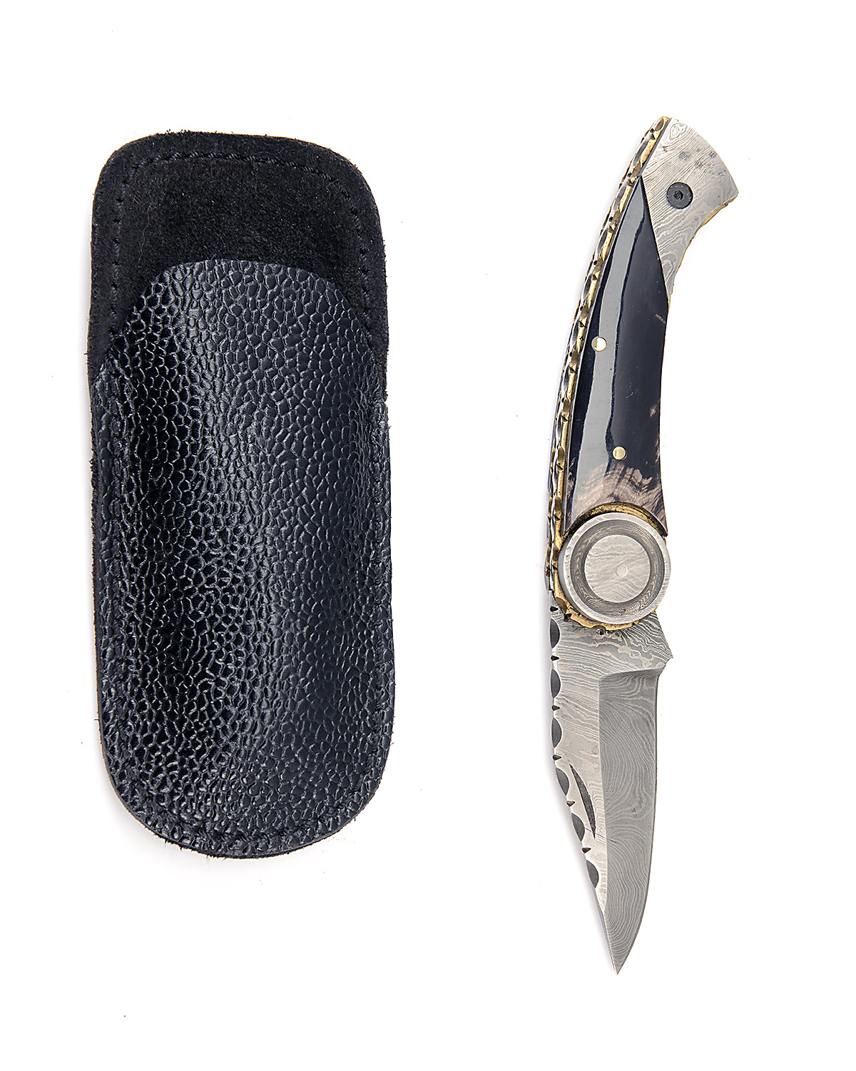A DAMASCUS BLADED FOLDING-KNIFE WITH DAMASCUS MOUNTS, UNSIGNED with non-locking 2 7/8in. damascus blade with scalloped back for its full length bar extreme tip, turned damascus drum bolsters, brass liners with scalloped edges, scalloped bach and smooth polished horn scales, in a pebbled leather pouch