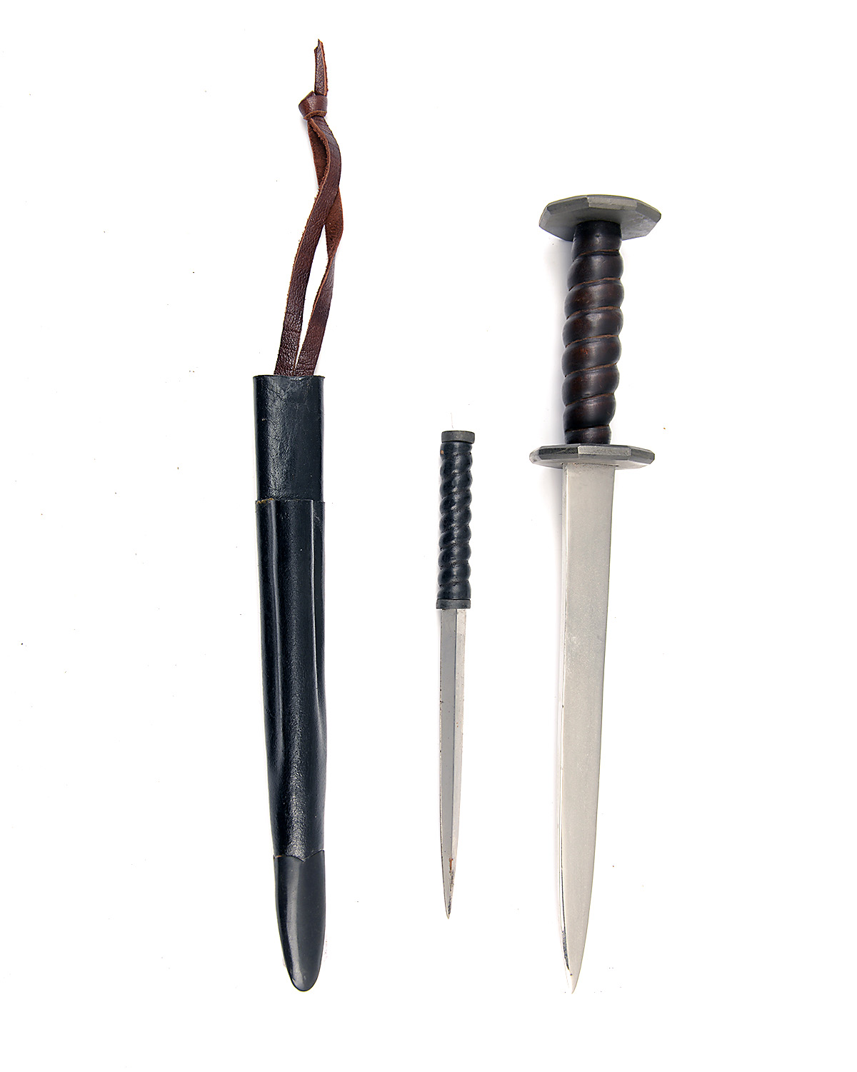 A REPRODUCTION 'RONDEL' DAGGER, with double edged 9in. blade, octagonal guard and pommel-cap and ribbed wood grip, in a leather scabbard with further small stiletto housed in a front pocket
