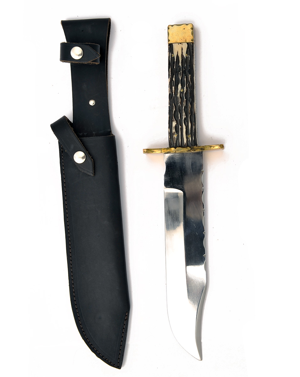 A LARGE BOWIE-KNIFE SIGNED 'R. COOPER, SHEFFIELD', with 10in. blade, scalloped back edge, moulded brass cross-guard with en-suite pommel and natural stag scales, in a black leather scabbard