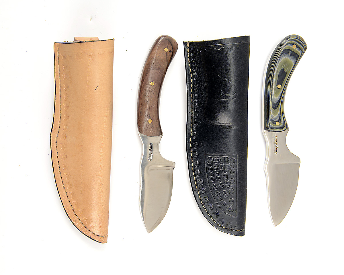 TWO SKINNING-KNIVES SIGNED HARRY BODEN, both with approximately 2 1/4in. drop-point blades, thumb-rests and finger-grooves at the forte and one fitted with smooth micarta scaled, the other polished wood, both in leather bucket scabbards