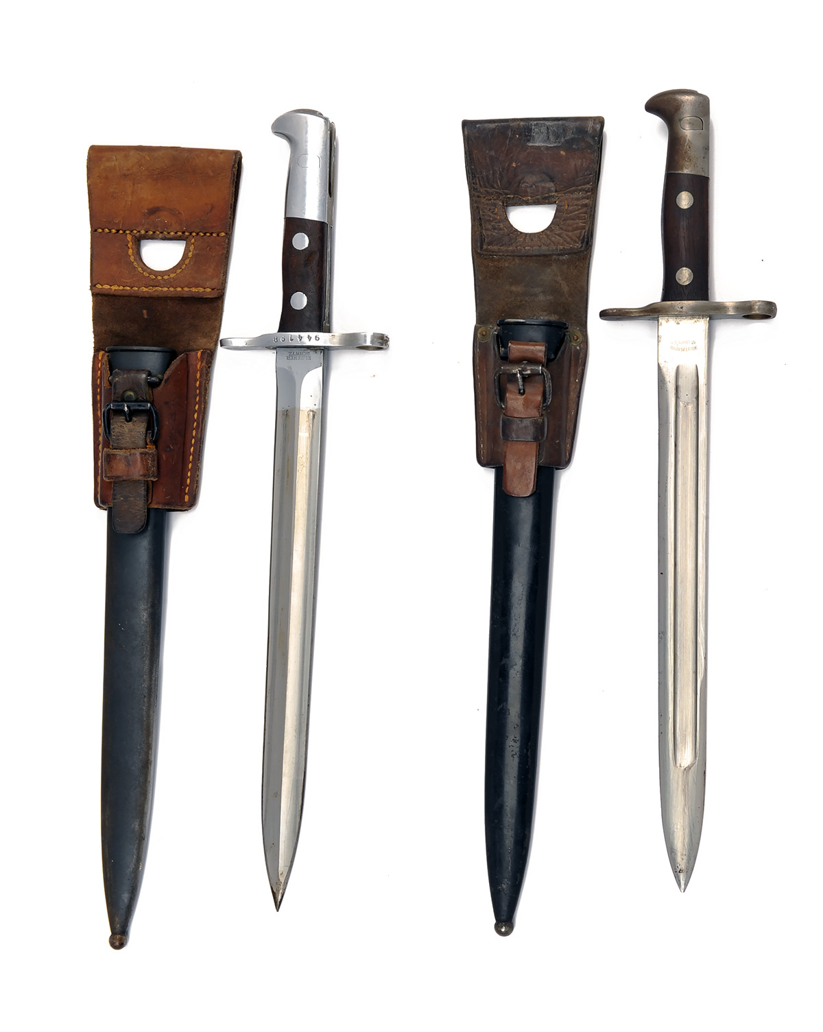 * TWO SCHMIDT-RUBIN M11/K31 BAYONETS, both with scabbards and leather frogs, one of each blade type