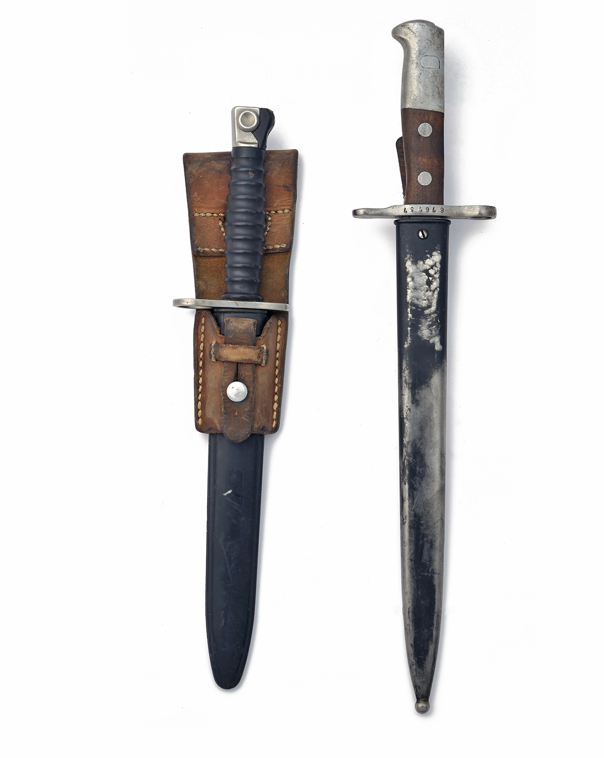 ** TWO SWISS BAYONETS, the first a double edged type for a K31, the second an example for the STGW57, both with scabbards, the second with leather frog