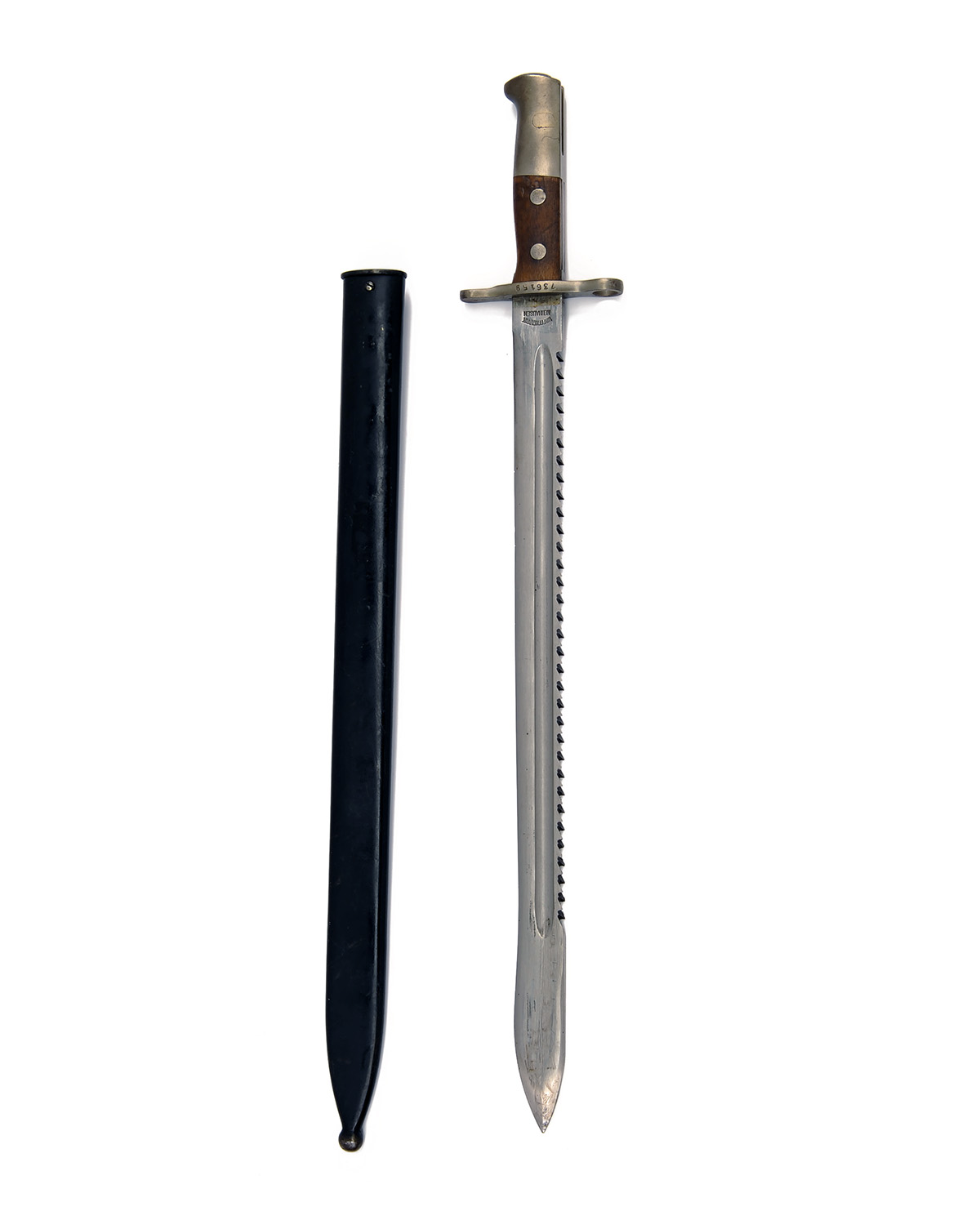 * A SWISS M18 SAW-BACKED PIONEER'S BAYONET, complete with black metal scabbard