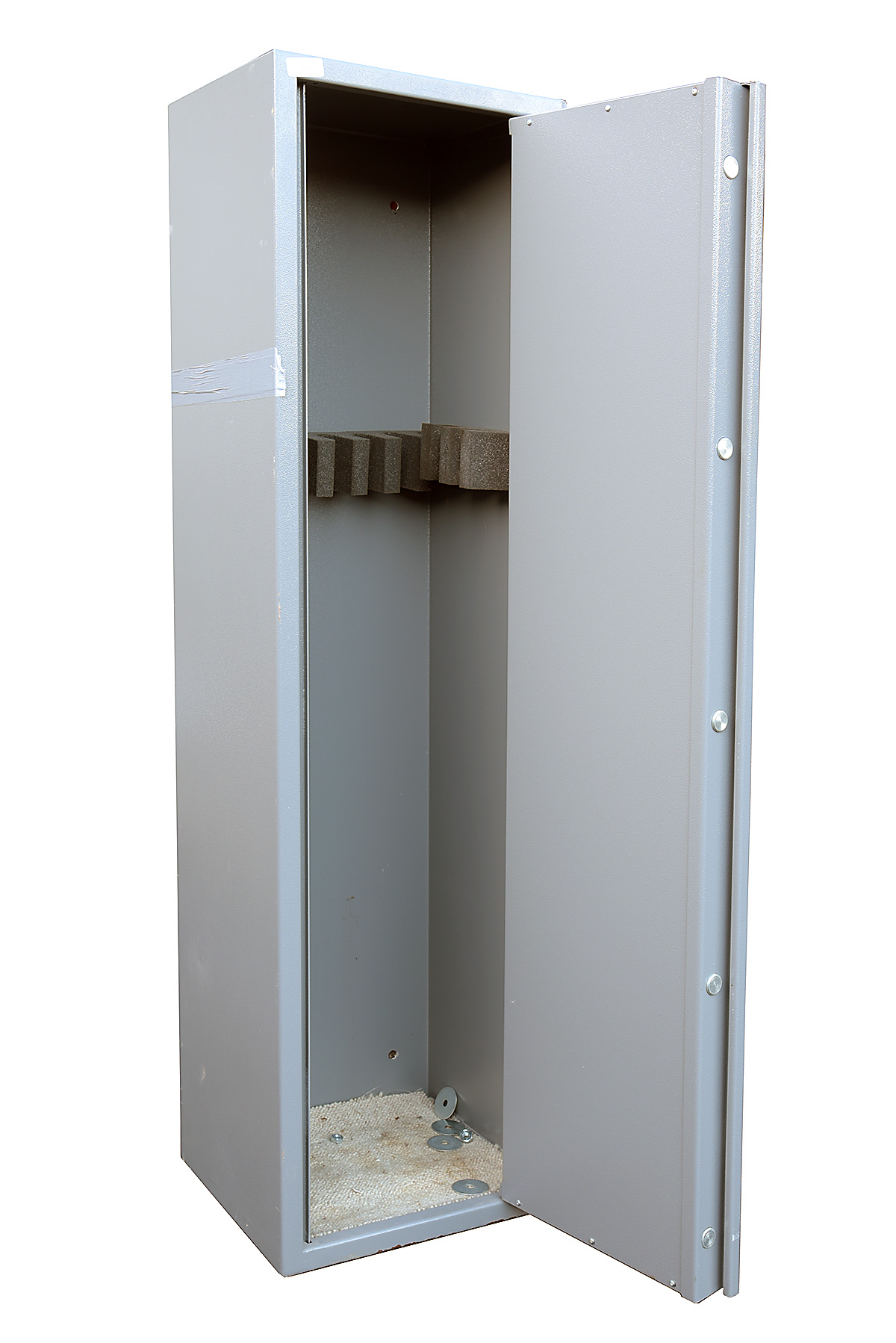 A BRITISH APPROVED STEEL GUN CABINET, fitted for 10 guns, measuring approx. 60in. x 16in. x 13 1/2in. (including keys
