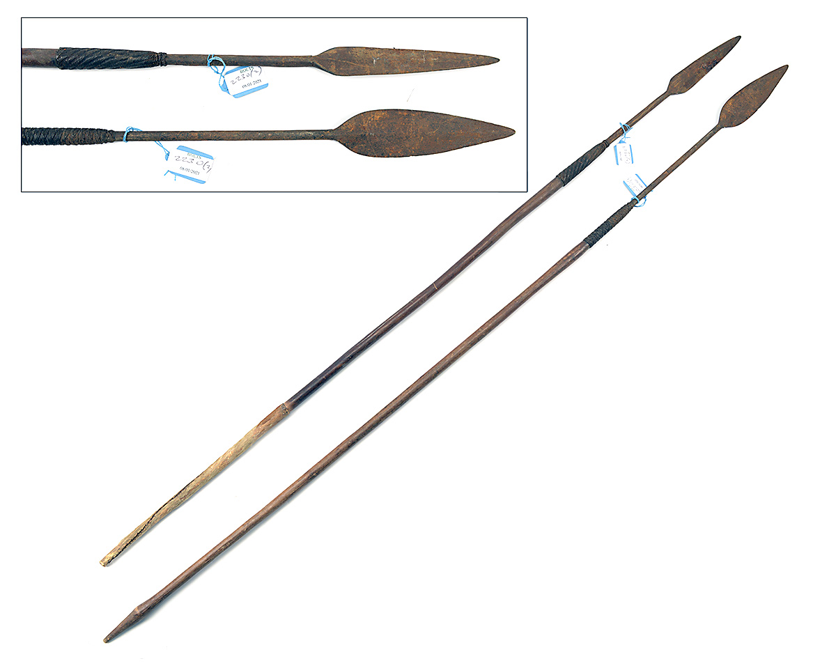 A PAIR OF ZULU ASSEGAI IKLWA/STABBING SPEARS probably late 19th century, possibly earlier with the shafts bound to the heads with copper wire, one with a sewn cow hide terminal to the shaft, one 54in and one 57in. overall