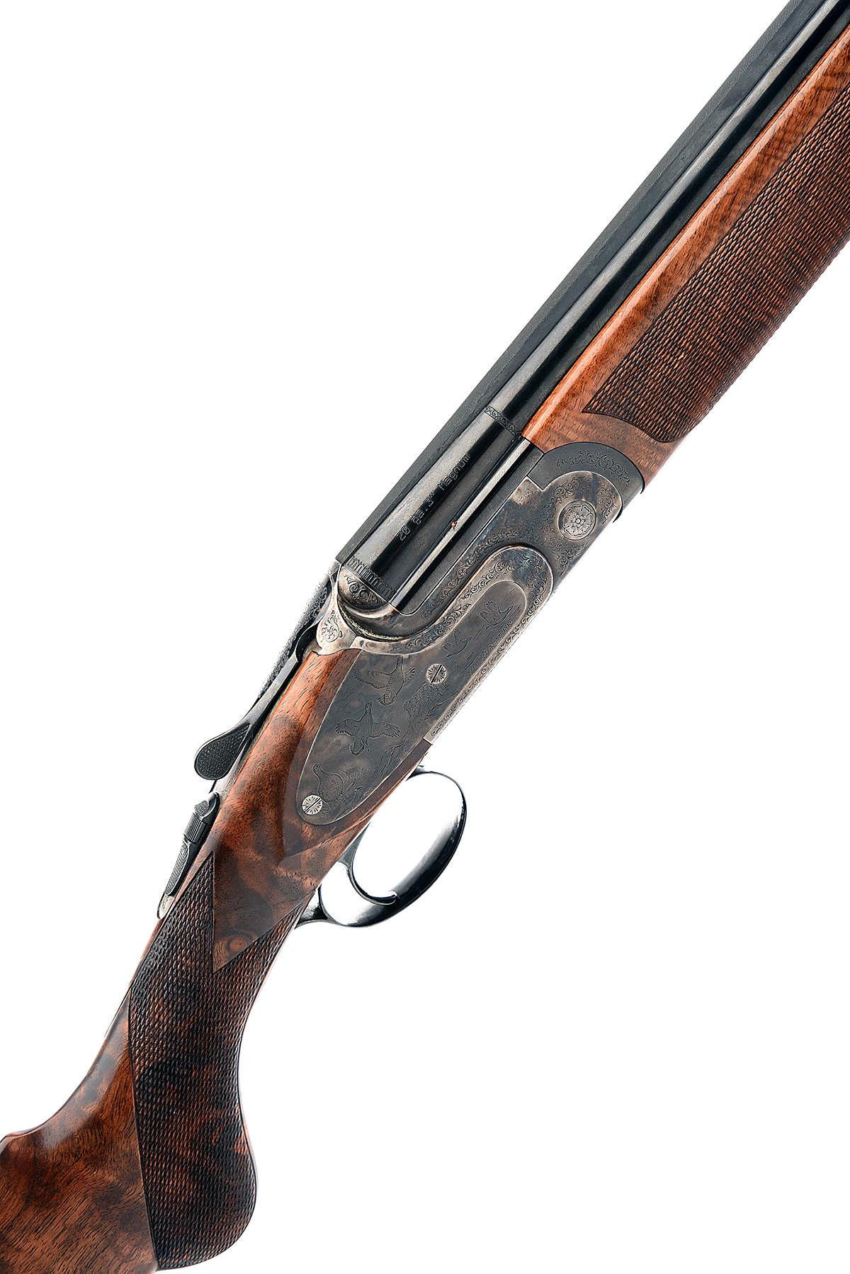B. RIZZINI 20-BORE (3IN.) 'JOHN MACNAB HIGHLANDER' SINGLE-TRIGGER SIDEPLATED OVER AND UNDER EJECTOR, serial no. 47080, dated 2003, 29 1/3in. nitro barrels with 8mm solid rib, 3in. chambers, bored approx. 1/4 and 1/2 choke, hold-open toplever, automatic safety with integral barrel selector switch, acanthus scroll engraving, the decorative sideplates with game scenes, the underside engraved with the 'MacNab', retaining some original colour-hardening and finish, 14 3/8in. semi-pistolgrip stock (cracked through and repaired at hand), weight 6lb. 2oz.