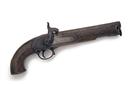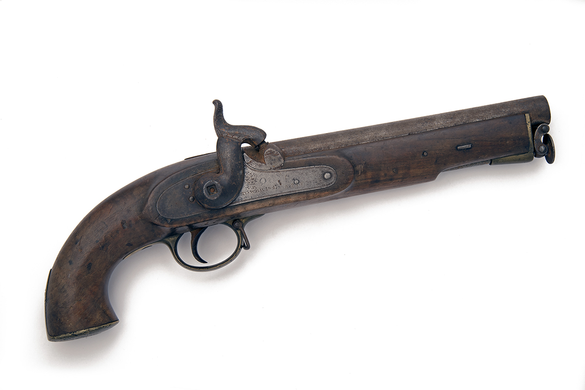 dated for 1847 and of Heavy Lancer's style, with round iron 9in. unsighted barrel, solid top-tang, borderline engraved bar-action lock signed 'TOWER' together with the date and a Queen's crown device, walnut full-stock marked on the left cheek 'WALKER' and 'T. POTTS', with brass butt-cap and trigger guard, iron swivel to front of guard and brass nose-plate with captive iron ramrod at muzzle, 16in. overall, weight approximately 3 1/4lbs.
