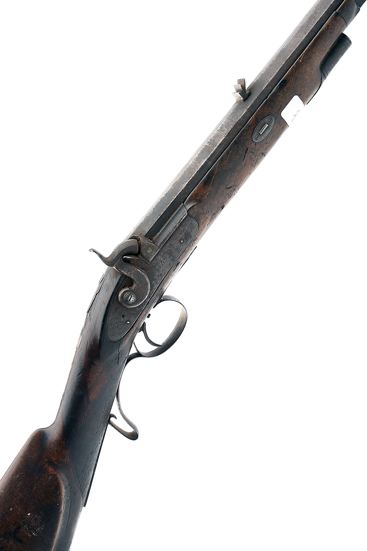 A 16-BORE PERCUSSION SINGLE BARRELLED SPORTING-RIFLE FOR DANGEROUS GAME SIGNED POWELL, no visible serial number,