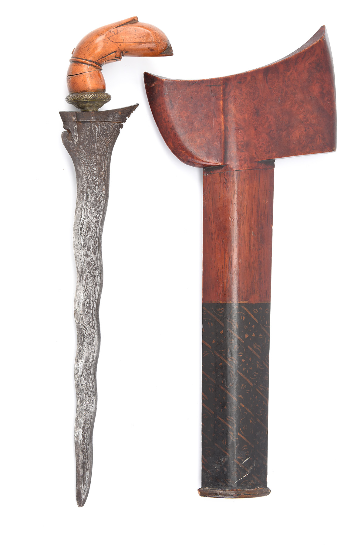 * AN INDONESIAN KRIS WITH WOODEN SCABBARD, early 20th Century, with 12 in. decorated 'waved' blade of typical form with carved wooden Garuda bird hilt with brass mount, bi-wood scabbard, hilt split and requires re-attaching to the tang